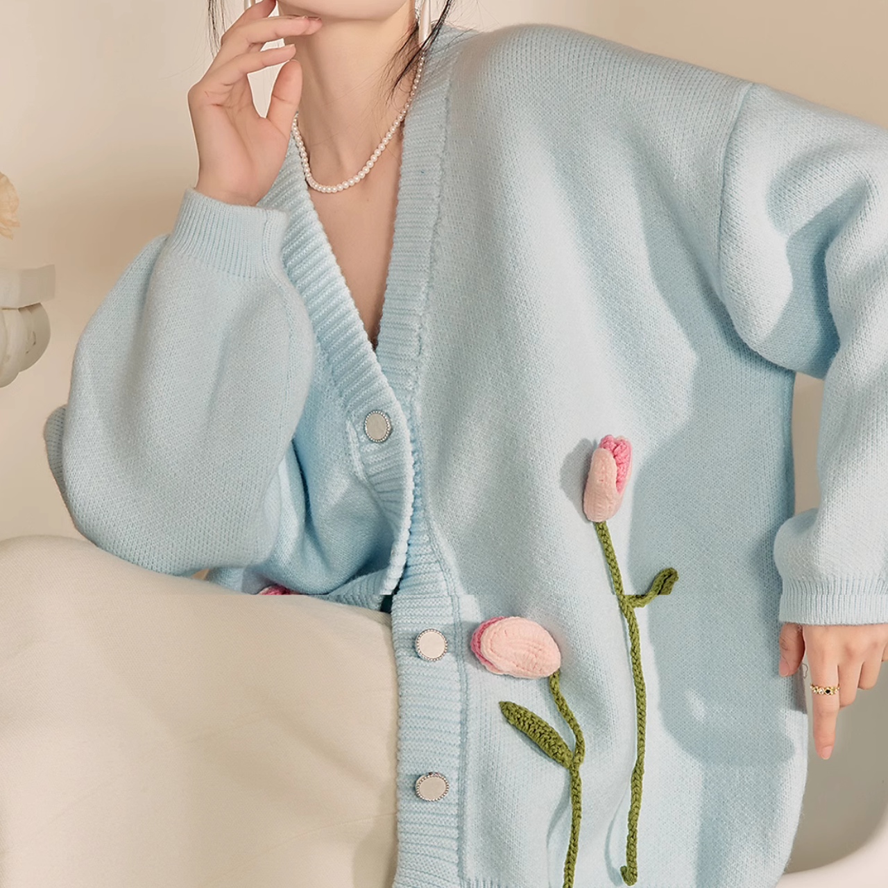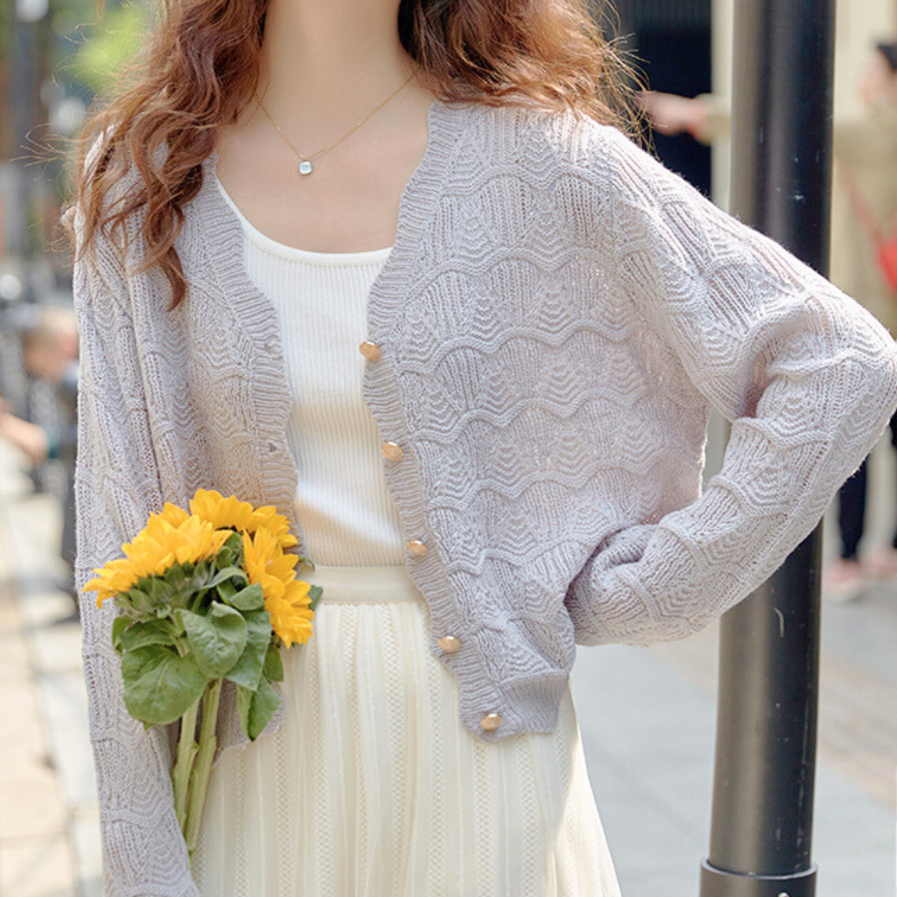 ゴールドボタンの模様編みカーディガン 000096